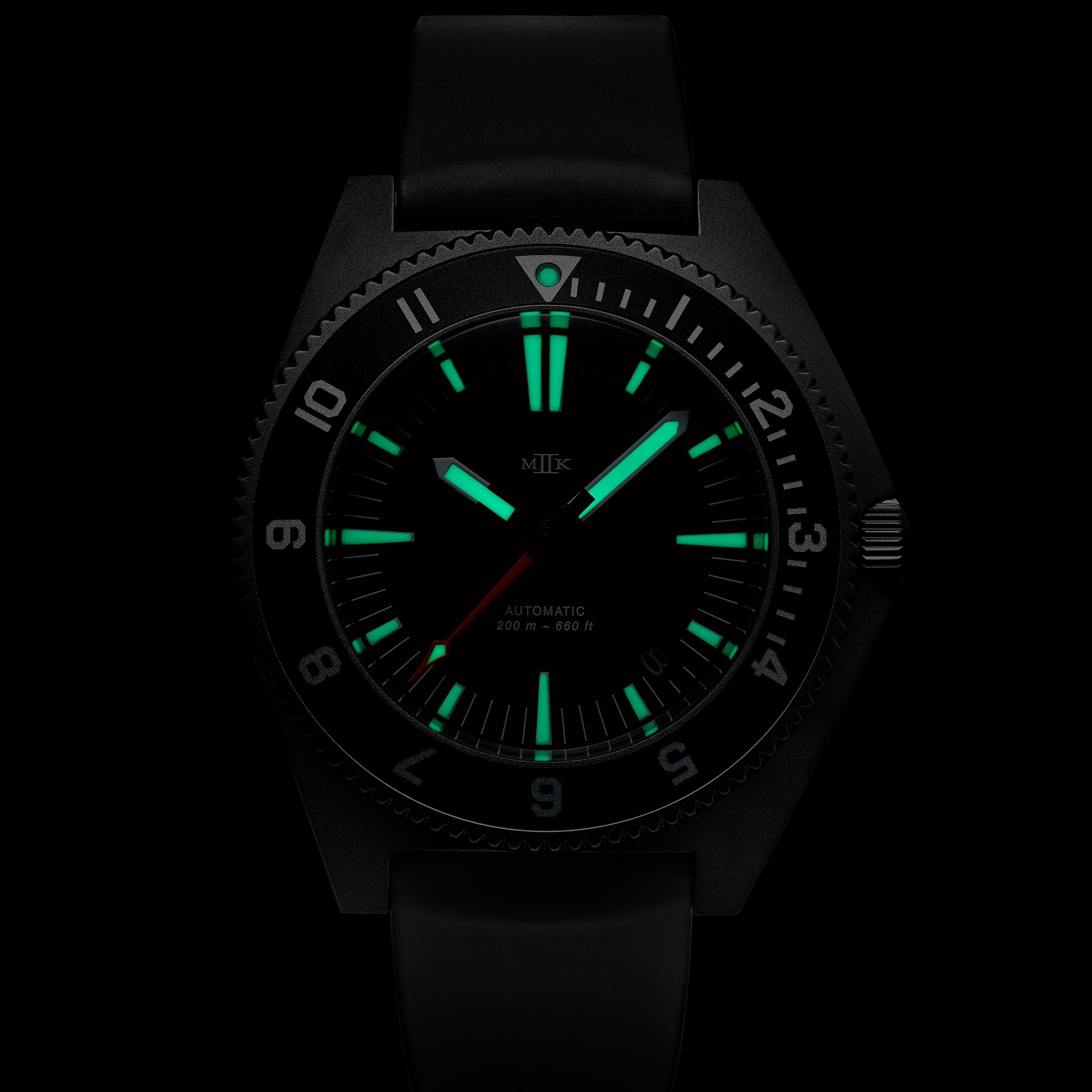 The dial design is lifted from the early Mk II archives using luminous markers to break up the dial into 15 minute quadrants. The date window has been moved to an auxiliary position at 4.30 to preserve all of the lume markers on the dial. The night time visibility is supplied by a proprietary formulation of SuperLumiNova, a non-radioactive luminous material.