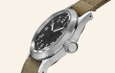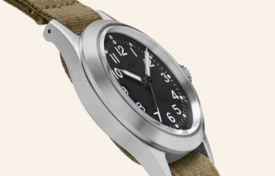 The Hellion-BAKU was originally designed as a blend of the A-11 and the UDT’s canteen watch. Using the case architecture introduced by Rolex in 1926, that has become the defacto standard for water resistant watches, paired with modern materials and drilled lugs BAKU is water resistant to 100 meters; suitable for the free diving and “no-decomp” dives the UDTs performed at the time. The oversized “cap” crown is a nod to the “canteen” watches issued to the UDT and makes the crown easier to use with wet and cold hands. At 39 mm in diameter the case is larger than the reference design while still within period norms making it equally at home in 1944 or 2025.